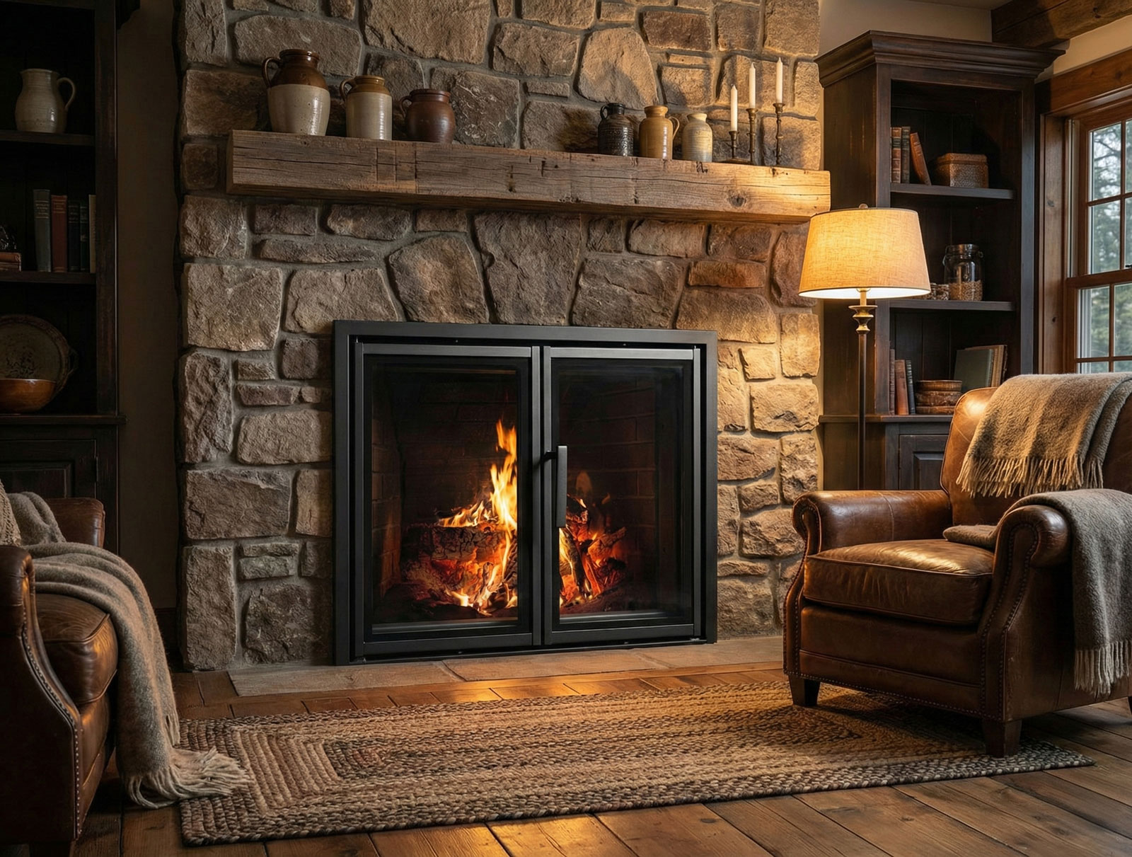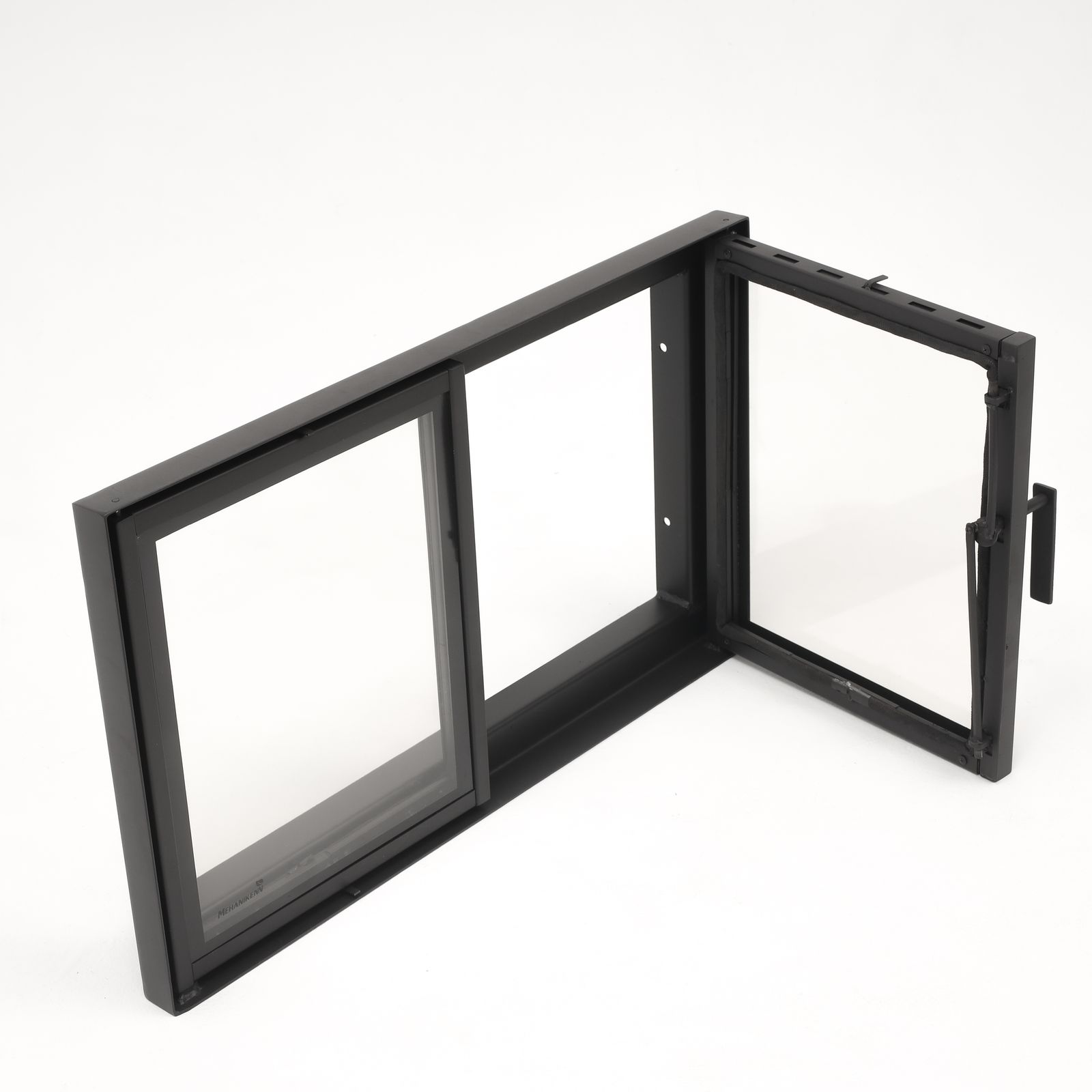 Премиум 2 створки — двухстворчатая дверка для камина и печи-камина с прямоугольным проёмом, рассчитанная на широкие топки. Две симметричные створки открывают проём целиком: удобно подсаживать дрова, контролировать горение и проводить чистку; при закрытых створках сохраняется аккуратный, «собранный» вид фасада.
